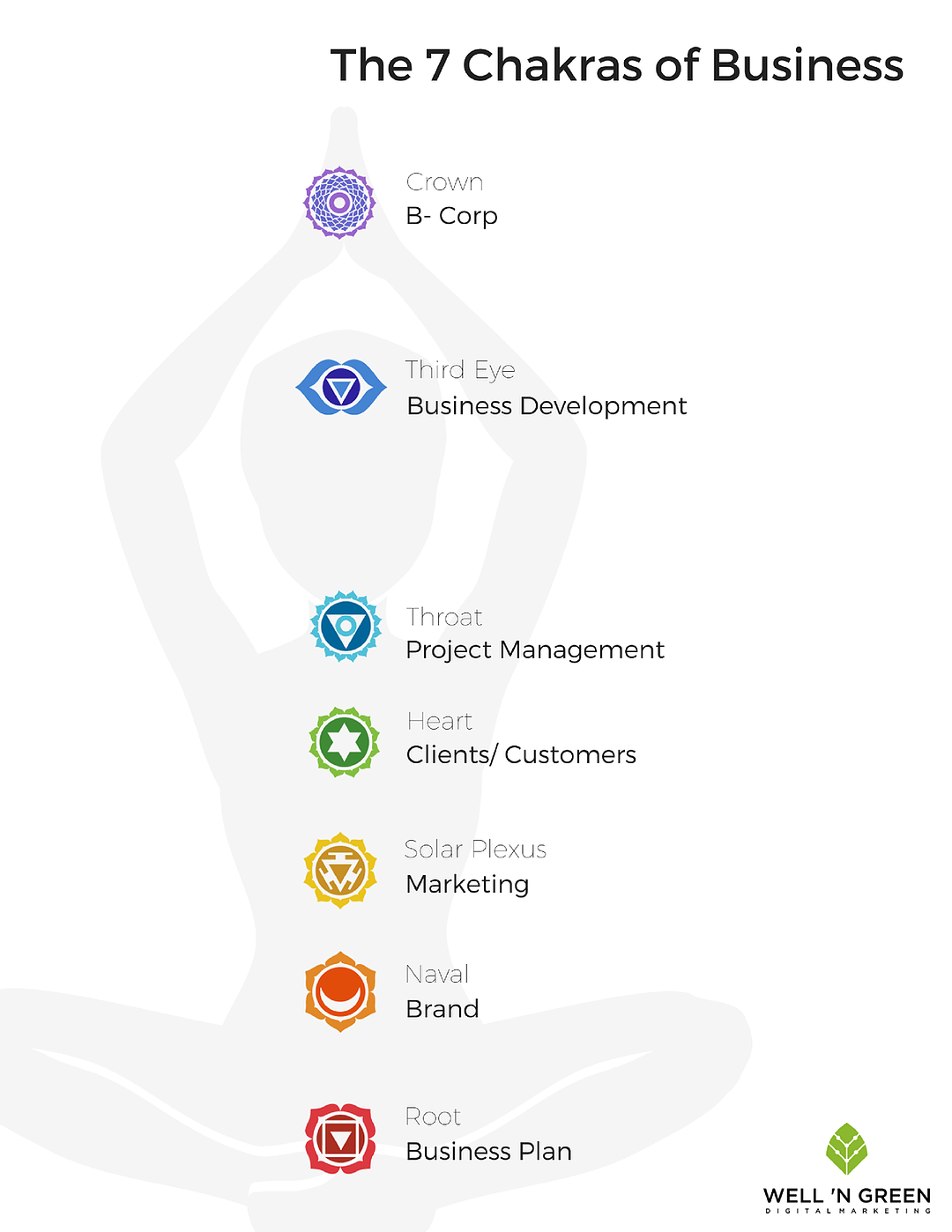 The third eye of business is your business development. Now you can ask yourself, where do you want to go? Where do you want to grow? Do you want to expand your horizons, expand your business and assimilate into another market? What is your businesses fullest potential, and how are you going to get there? When you have an unbalanced third eye, you can suffer from lack of focus, and the inability to visualize your future. If your business feels stagnant snd you haven’t grown in a while or at all, it might be time to look for more options. If you want more out of your life and your business, consider hiring a business development consultant like us, Well ‘N Green Digital Marketing (ww.wellngreen.com). If you have ideas on how to further your business, and aren’t sure how to implement them, business development consultants are trained and specialized in ways to help businesses grow. They can implement a plan to reach your goals and manage the project and support you through the process along the way. Business Development and visualization are vital in the self actualization of people and your business.